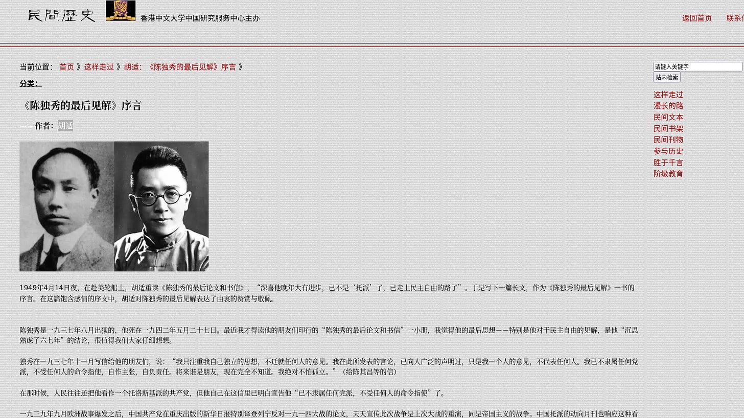 陈独秀多年的好友胡适1949年4月14日夜,在赴美轮船上,重读《陈独秀的最后论文和书信》,“深喜他晚年大有进步,已不是‘托派’了,已走上民主自由的路了”。于是写下一篇长文,作为《陈独秀的最后见解》一书的序言。在这篇饱含感情的序文中,胡适对陈独秀的最后见解表达了由衷的赞赏与敬佩。